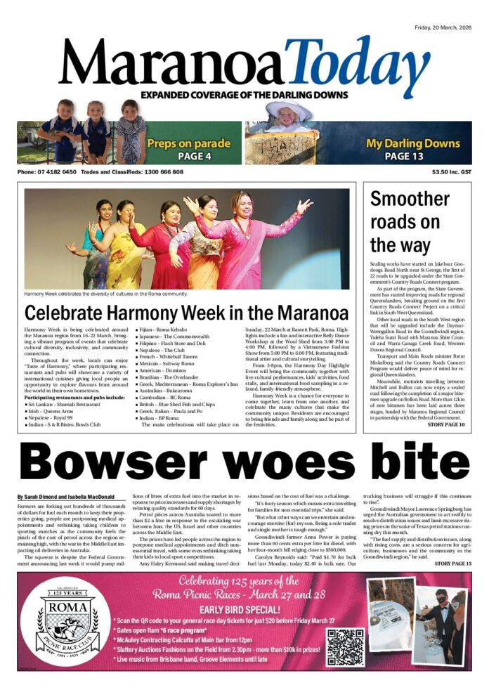 Maranoa Today – 20th March 2026 Subscribe or Login to see the rest of the content. Username Password * Remember Me Forgot Password News 5th annual Darren Lockyer Shield draws a resounding success 14/04/2026 Roma came alive with the energy of junior rugby league over the weekend as the Darren Lockyer Shield returned, with the Carnarvon Cubs hosting... Cods fall to premiers 14/04/2026 The Condamine Cods have opened their 2026 Risdon Cup campaign with a 36–26 loss to defending premiers Gatton Black Pigs at Hugh Courtney Oval... Emus fight off rust and a determined Echidna’s to get a round 1 win 14/04/2026 The Goondiwindi Emus have launched their Risdon Cup campaign in strong fashion, overcoming a spirited Roma Echidnas outfit 27–19 at Gallas Fox Park on...