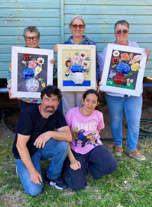 Deniece, Fiona and Meryl with their completed artworks and Alexander and Solange Piffer at front, international tutors at BCC Flower Mosaic Workshop held recently.