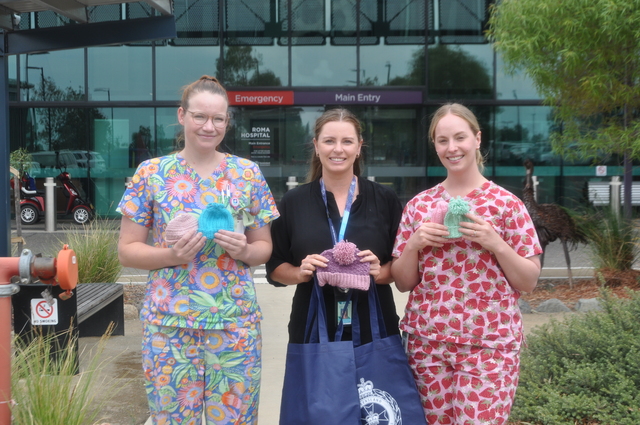 Roma Hospital midwives Gabbie Wilson and Mollie Waldron recieved a donation of beanies from Monique Rashford from Community Corrections Roma on behalf of offenders who knitted the beanies.