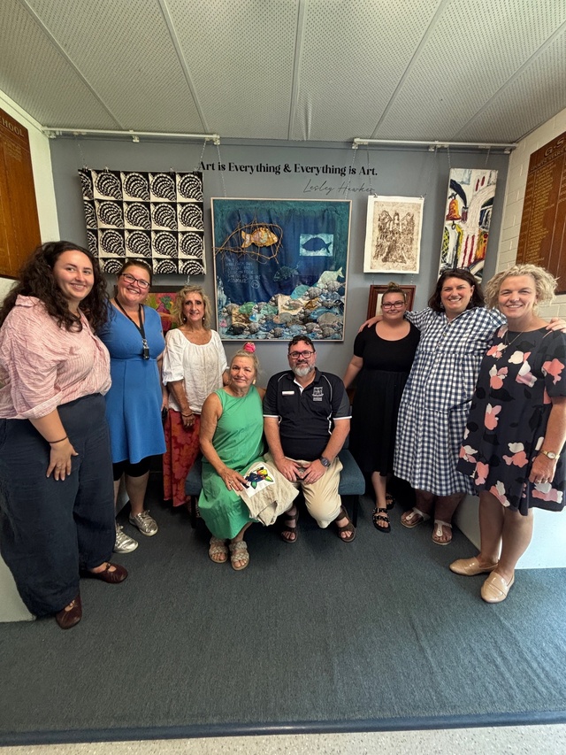 Lesley Hawker with principal Brett Hallett and Goondiwindi State High School staff at the opening of the Lesley Hawker Art Gallery. (Supplied)
